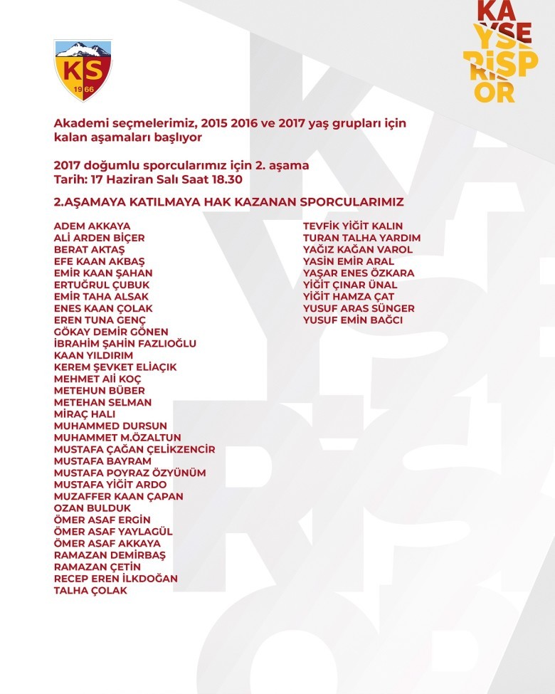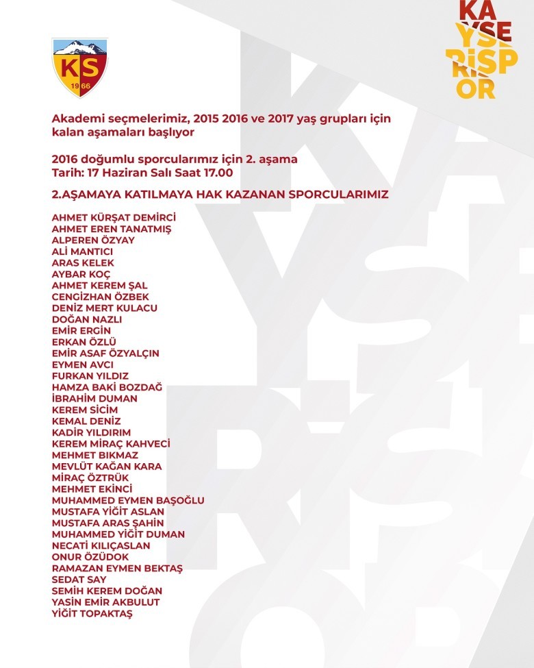 Kayserispor geçen senelerde olduğu gibi bu sene de alt yapı seçmeleri yaptı. Kulüp alt yapı antrenörleri eşliğinde yapılan seçmeler 5 yaş grubu üzerinden gerçekleştirildi. Kayserispor Alt Yapı tesislerinde yapılan seçmelerin ilk etabı bugün sona erecek. Seçmeler hakkında açıklama yapan , Kayserispor Yönetim Kurulu Üyesi ve Alt Yapı Sorumlularından Ali Sofularlı, “Alt yapı seçmelerimize devam ediyoruz. Kurban Bayramından önce 2005 – 2006 ve 2007 doğumluların seçmelerini yaptık. Buradan seçilen isimleri yayınladık. Bu yaş grubunun ikinci etap seçmelerini 17 Haziran’da yapacağız. Dün ise 2010 doğumlularla başladık, bu seçmelere ortalama 350 sporcu katıldı. Daha sonra 1013 ve 2014 doğumluların seçmeleri yapıldı. Alt yapı seçmelerine 2 bin 500 kişi kayıt yaptırdı. Diğer yaş kategorisinden de ilk etapta seçtiklerimizi daha sonra ikinci kez seçmelere alacağız. Sürecimiz bu şekilde devam ediyor” dedi.