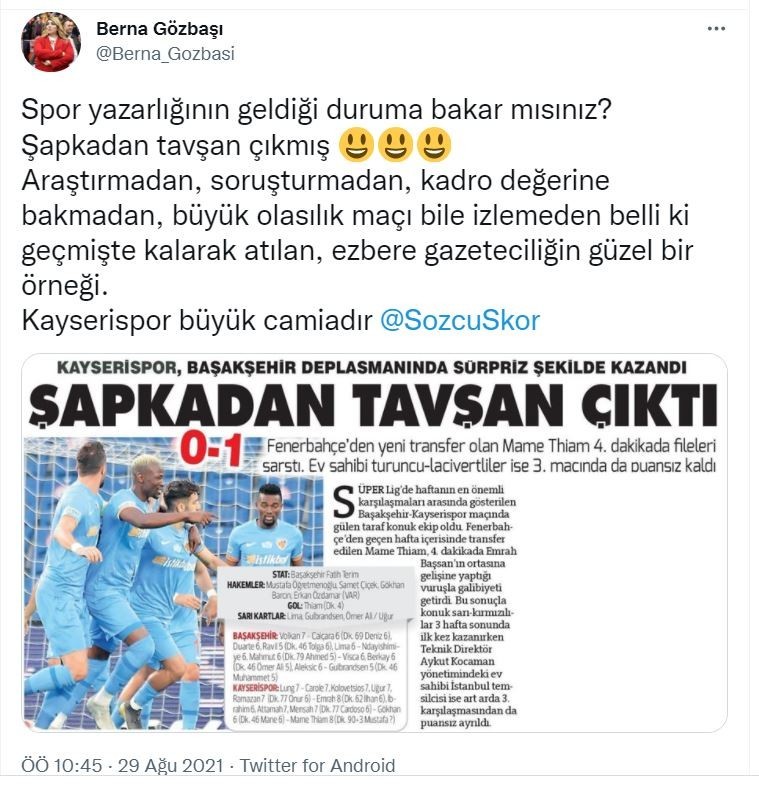 Kayserispor Başkanı Berna Gözbaşı, Süper Lig'in 3.haftasında deplasmanda Başakşehir ile karşılaşan ve müsabakayı 10 kazanan takımının galibiyetinin Sözcü Gazetesi tarafından tesadüf olarak addedilmesine tepki gösterdi. Kayserispor Başkanı Berna Gözbaşı;