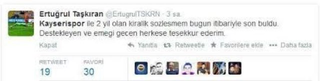 Kayserispor'da 2 sezondur kaleyi koruyan Ertuğrul Taşkıran Twitter hesabından yaptığı açıklamada ;