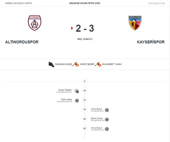Kayserispor sezonun ilk hazırlık maçında Altınordu'yu Erzurum'da 3-2 mağlup etti.İlk yarısını Alican Özfesli'nin 24.Dakikada Penaltı'dan ve 33.Dakikada Fatih Aktay'ın attığı goller ile 2-0 mağlup olarak kapadık.2.Yarıya Kayserispor 70.Dakikada ve 90+ dakilarda Umut Bulut ve Yine 90.dakikada Şamil Çinaz'ın attığı goller ile 3-2 galip ayrıldık.