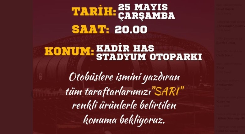 DUYURU | Hareket saatimiz Çarşamba - 20.00 olarak belirlenmiş olup, oluşabilecek yoğunluktan ötürü herkesin verilen saatten önce hareket noktasında hazır olmaları önemlidir. Ayrıca görsel bütünlük adına tribün kombin rengimiz "SARI" olarak belirlemiştir. Önemle Duyurulur.