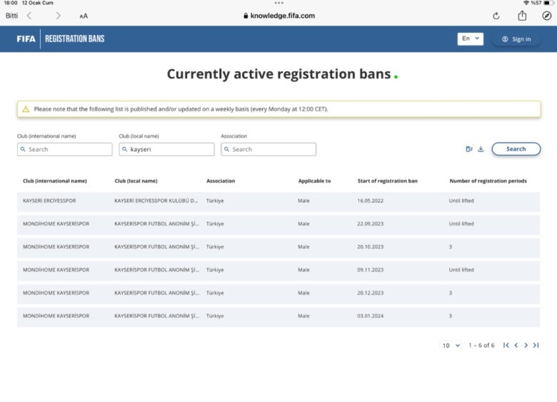 FIFA nın resmi sitesinde yazan metin Türkçe’ye tercüme edildiğinde başka bir mana çıkıyor ortaya. Bu nedenle bu haber tam olarak böyle değil, futbolcu transferinde dosya borcunu öderseniz yasağı kaldırabilirsiniz. Kayserisporlu taraftarlarımızın içi rahat olsun. “FIFA’nın transfer yapamaz raporu verdiği kulüpler. Kesin olarak transfer yasağı alan kulüpler değil.