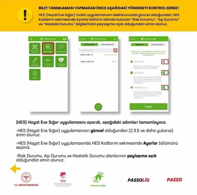 - Hayat Eve Sığar (HES) uygulama üzerinden, HES kodu ayarlarında bulunan; Aşı Durumu, Hastalık Durumu, Test Durumu’nu aktif hale getirmeleri ve ayrıca uygulamanın güncel olması gerekmektedir.