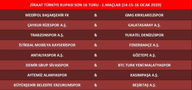 Ziraat Türkiye Kupası Son 16 Turu Kura Çekimi, Riva'da bugün yapıldı. TFF Hasan Doğan Milli Takımlar Kamp ve Eğitim Tesisleri Orhan Saka Konferans Salonu'nda gerçekleştirilen kura çekimine; Türkiye Futbol Federasyonu Başkan Vekili Yılmaz Büyükaydın, Yönetim ve İcra Kurulu Üyesi Ali Düşmez, Yönetim Kurulu Üyesi İsmail Erdem, Genel Sekreter Yardımcısı Özcan Şepik, kulüp başkanları ve temsilcileri katıldı.