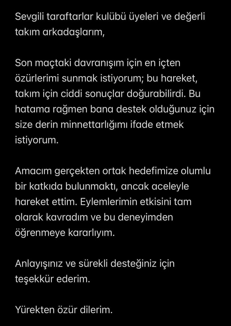 'Sevgili taraftarlar, kulübümüz üyeleri ve değerli takım arkadaşlarım... Son maçtaki davranışım için en içten özürlerimi sunmak istiyorum; bu hareket takım için ciddi sonuçlar doğurabilirdi. Bu hatama rağmen bana destek olduğunuz için size derin minnettarlığımı idafe etmek istiyorum. Amacım gerçekten ortak hedefimize olumlu bir katkıda bulunmaktı. Ancak aceleyle hareket ettim. Eylemlerimin etkisini tam olarak kavradım ve bu deneyimden öğrenmeye kararlıyım. Anlayışınız ve sürekli desteğiniz için teşekkür ederim. Yürekten özür dilerim.'