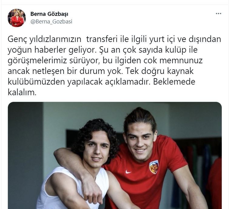 Sosyal medya hesabından yaptığı açıklamada Gözbaşı, "Genç yıldızlarımızın transferiyle ilgili yurt içi ve dışından yoğun haberler geliyor. Şu an çok sayıda kulüp ile görüşmelerimiz sürüyor.