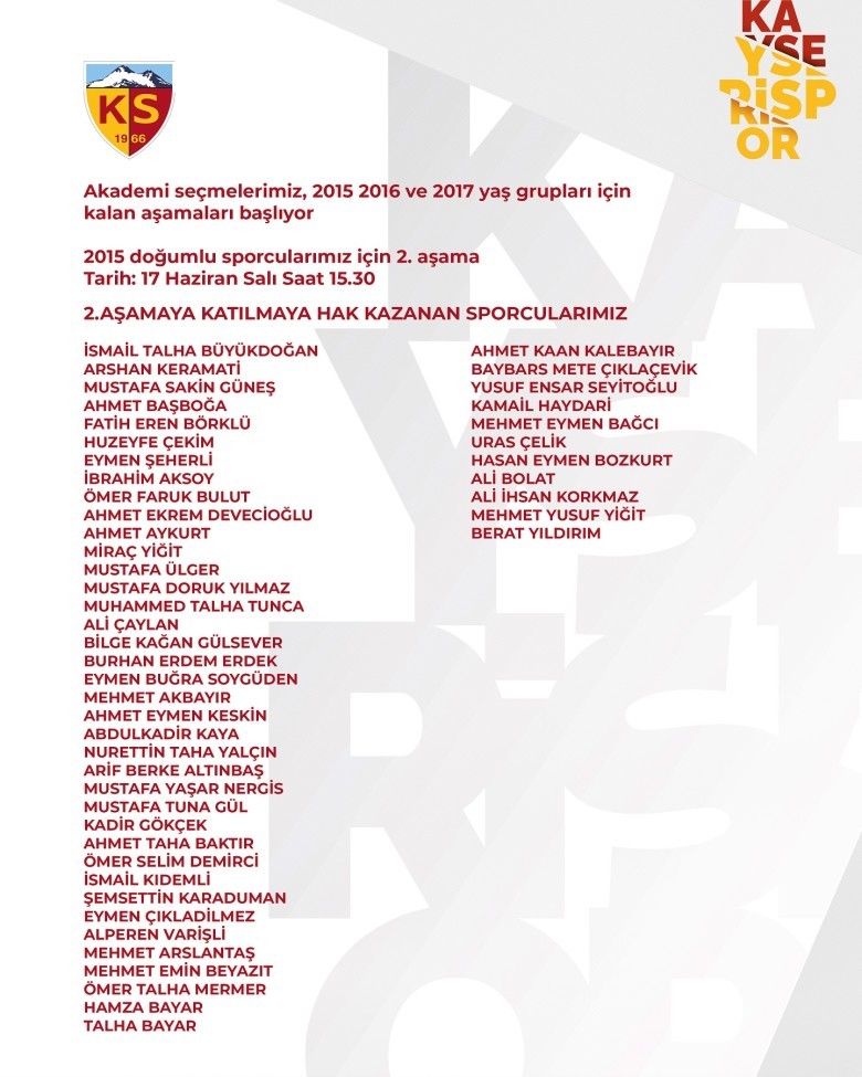 Kayserispor geçen senelerde olduğu gibi bu sene de alt yapı seçmeleri yaptı. Kulüp alt yapı antrenörleri eşliğinde yapılan seçmeler 5 yaş grubu üzerinden gerçekleştirildi. Kayserispor Alt Yapı tesislerinde yapılan seçmelerin ilk etabı bugün sona erecek. Seçmeler hakkında açıklama yapan , Kayserispor Yönetim Kurulu Üyesi ve Alt Yapı Sorumlularından Ali Sofularlı, “Alt yapı seçmelerimize devam ediyoruz. Kurban Bayramından önce 2005 – 2006 ve 2007 doğumluların seçmelerini yaptık. Buradan seçilen isimleri yayınladık. Bu yaş grubunun ikinci etap seçmelerini 17 Haziran’da yapacağız. Dün ise 2010 doğumlularla başladık, bu seçmelere ortalama 350 sporcu katıldı. Daha sonra 1013 ve 2014 doğumluların seçmeleri yapıldı. Alt yapı seçmelerine 2 bin 500 kişi kayıt yaptırdı. Diğer yaş kategorisinden de ilk etapta seçtiklerimizi daha sonra ikinci kez seçmelere alacağız. Sürecimiz bu şekilde devam ediyor” dedi.