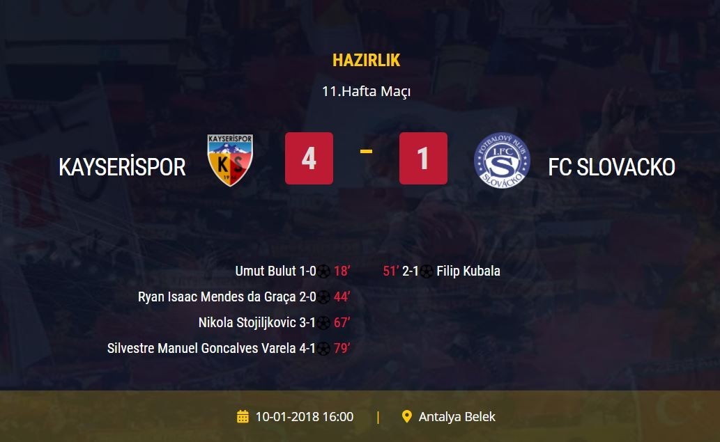 Çek Cumhuriyeti'nin Slovacko takımı ile karşılaşan Kayserispor, maçın 18. dakikasında takım kaptanı Umut Bulut'un şık golü ile öne geçti. Ardından maçın 44. dakikasında Ryan Mendes takımının ikinci golünü attı. Bu arada maçın 21. dakikasında Slovacko takımının kullandığı penaltı atışında kaleci Lung gole izin vermedi. Maçın ikinci yarısında oyuna dahil olan Silvestre Varela ve Nikola Stojiljkovic takımı adına goller kaydetti. NikolaStojiljkovic maçın 67. dakikasında fileleri havalandırırken Silvestre Varela da maçın 79. dakikasında gol atan isim oldu. Rakip takımın tek golü 51. dakikada Filip Kubala'dan geldi.