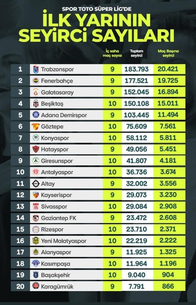 Süper Lig'de takımlara göre toplam seyirci sayıları açıklandı. Lider Trabzonspor 183 bin 193 ile zirvede, Fenerbahçe 177.521 ile 2. sırada, Galatasaray 152.045 ile 3. Sırada yer aldı. Kayserispor ise 9 Maçta 29 .073 toplam seyirci sayısı ve 3.230 ortalama seyirci sayısı ile 13. Sırada yer aldı