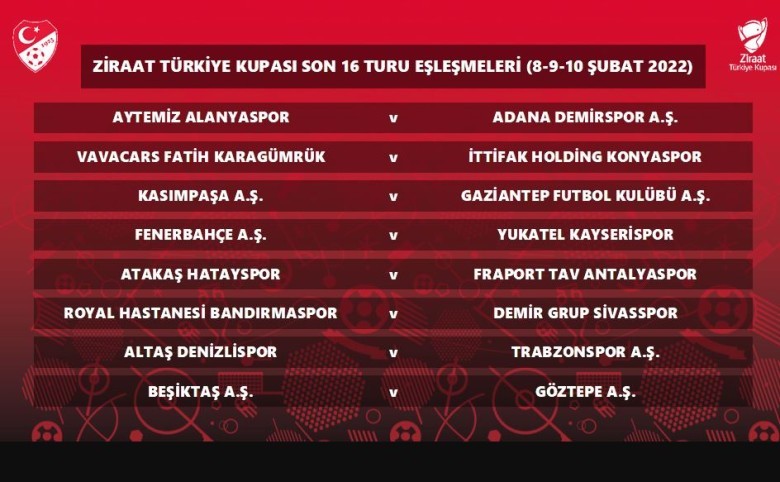 Tek maç eleme usulüne göre oynanacak Ziraat Türkiye Kupası Son 16 Turu müsabakaları; 8, 9 ve 10 Şubat tarihlerinde yapılacak. Kupada bu turdan itibaren Video Yardımcı Hakem (VAR) sistemi uygulanmaya başlanacak.