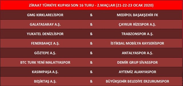 Ziraat Türkiye Kupası Son 16 Turu Kura Çekimi, Riva'da bugün yapıldı. TFF Hasan Doğan Milli Takımlar Kamp ve Eğitim Tesisleri Orhan Saka Konferans Salonu'nda gerçekleştirilen kura çekimine; Türkiye Futbol Federasyonu Başkan Vekili Yılmaz Büyükaydın, Yönetim ve İcra Kurulu Üyesi Ali Düşmez, Yönetim Kurulu Üyesi İsmail Erdem, Genel Sekreter Yardımcısı Özcan Şepik, kulüp başkanları ve temsilcileri katıldı.