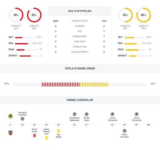⚽GOLLER ⚽ 38 Dk. Georgios Tzavellas (ALANYASPOR 1-0)’ ⚽ 59 Dk. Anastasios Bakasetas (ALANYASPOR 2-0)’ ⚽ 61 Dk. Demba Cisse (ALANYASPOR 3-0)’ ⚽ 84 Dk. Junior Fernandes (ALANYASPOR 4-0)’ ⚽ 88 Dk. Pedro Henrique (KAYSERİSPOR 4-1)’ ⚽ 90 Dk. Junior Fernandes (ALANYASPOR 5-1)’
