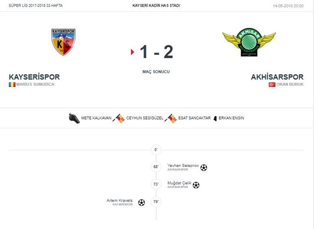 Goller: Kravets (dk. 79) (Kayserispor), Seleznov (dk. 69), Soner (dk. 73) (Teleset Mobilya Akhisarspor)
