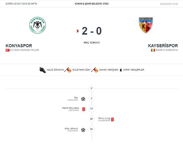 74'üncü dakikada Atiker Konyaspor'un kullandığı köşe atışında topa yükselen Mehdi'nin Sapanaru'a müdahelesi sonucu hakem Halis Özkaya, Mehdi'yi ikinci sarı karttan kırmızı kartla oyun dışı kaldı.