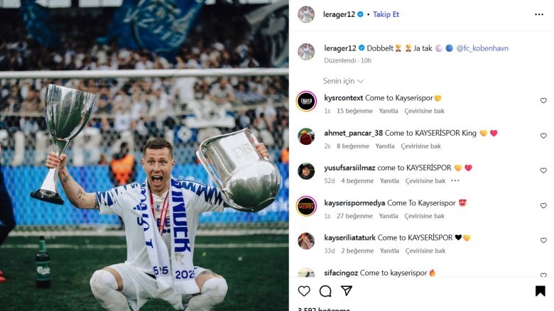 Sarı-Kırmızılı taraftar Lareger'in sosyal medya hesabına binleri aşan 'Come to Kayserispor' yorumu yaptı.
