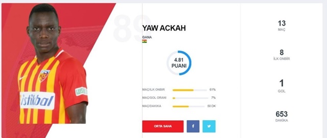 Ackah; Kayserispor’da 13 resmi maçta forma giydi. Bu maçlardan 8 tanesini ilk onbirde oynadı ve 1 gol attı.